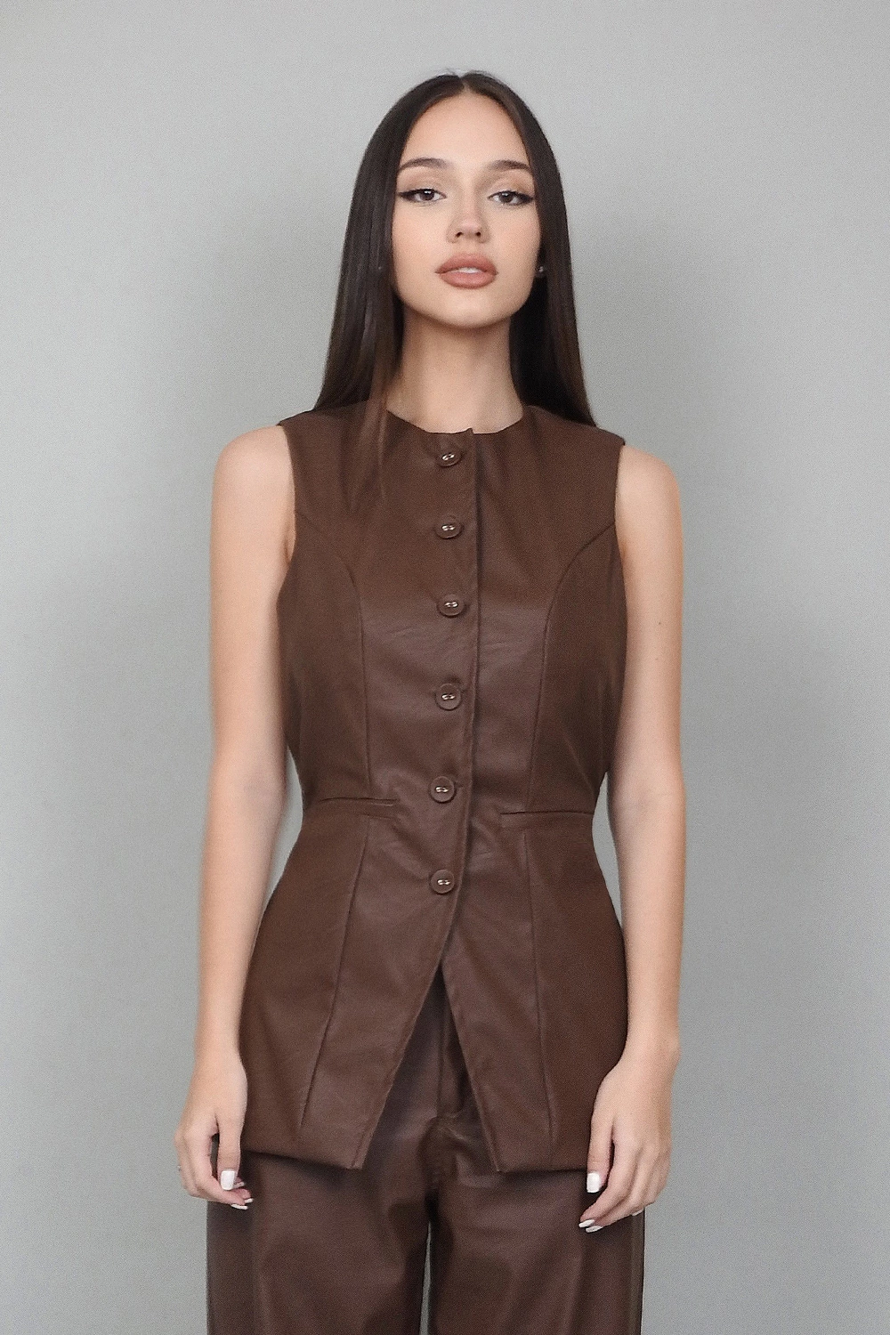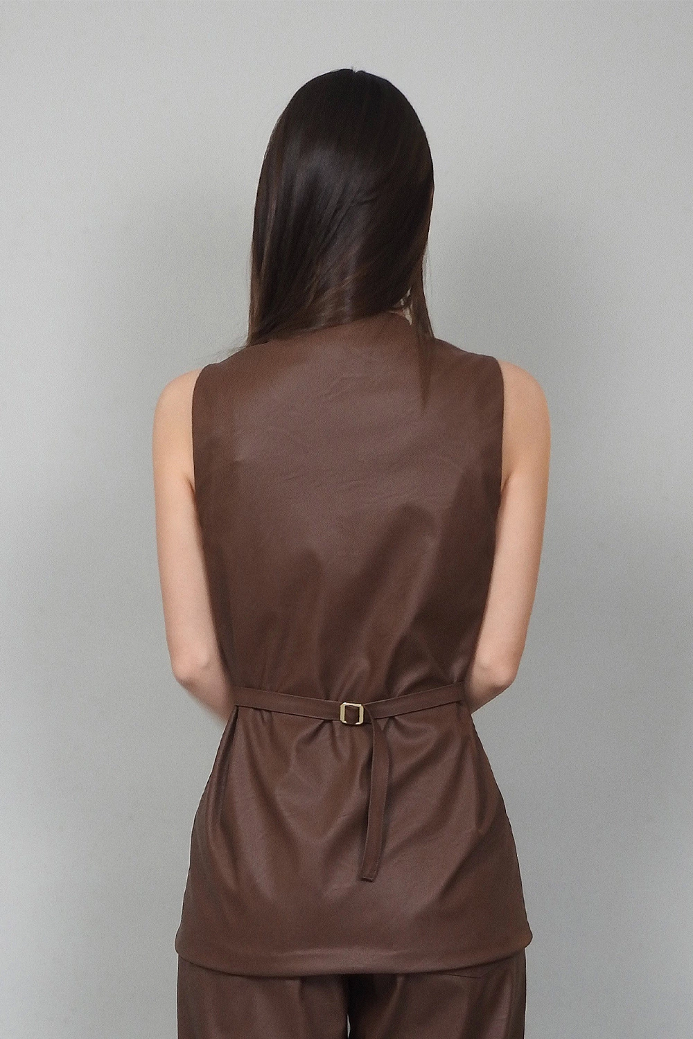 Colete / Blusa alongado com decote redondo e botões forrados. Fivela reguladora nas costas para proporcionar o uso mais solto ou mais acinturado. Forro de cetim embutido. Bolsos falsos frontais.