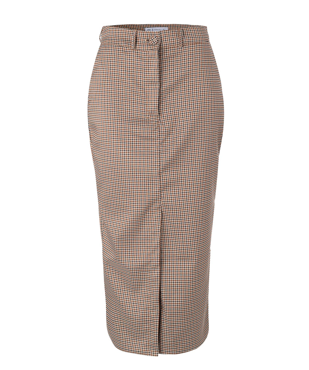 Saia Midi em tecido alfaiataria. Modelagem reta com fenda frontal. Fechamento com zíper e botão borrado. Cós com passantes para cinto. Bolsos laterais.