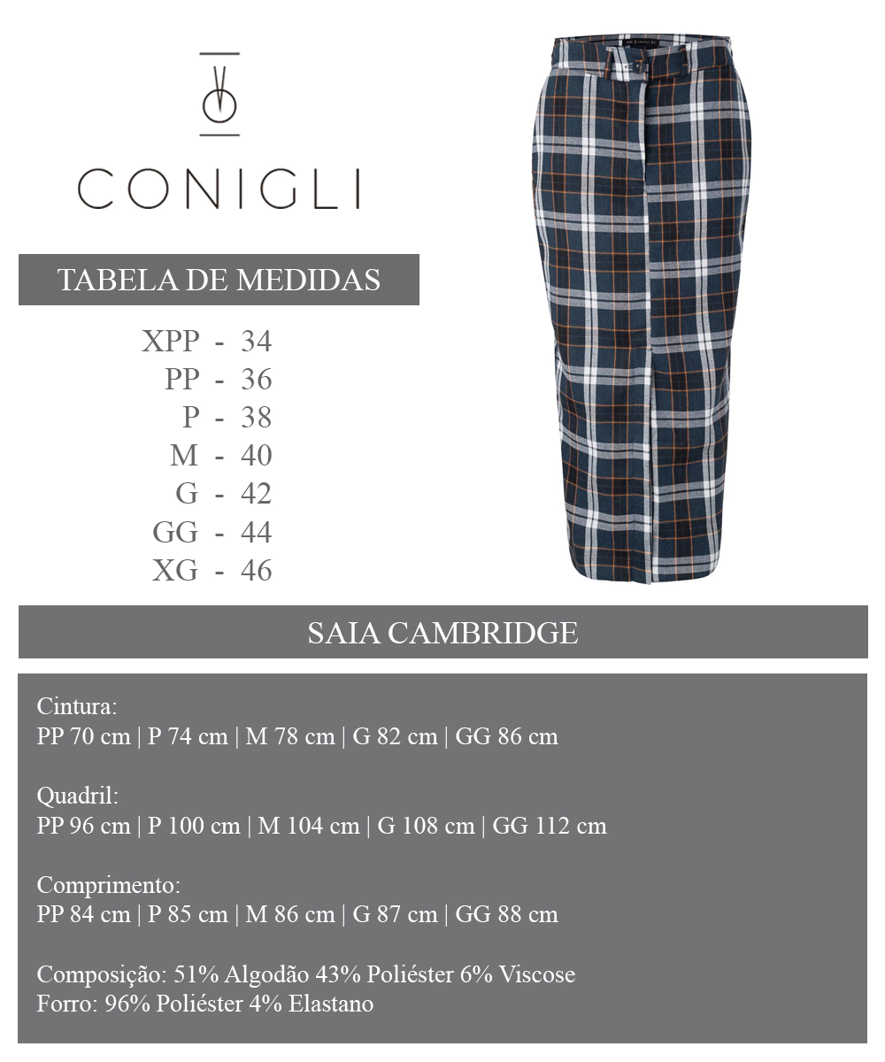 Quadril: PP 96 cm | P 100 cm | M 104 cm | G 108 cm | GG 112 cm