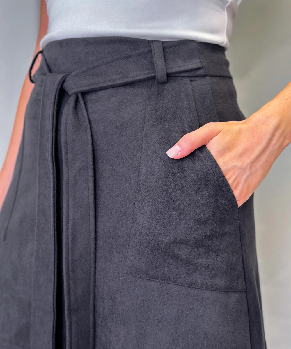 Saia Midi em malha Suede. Modelo evasê. Faixa na cintura para amarração. Zíper invisível nas costas.