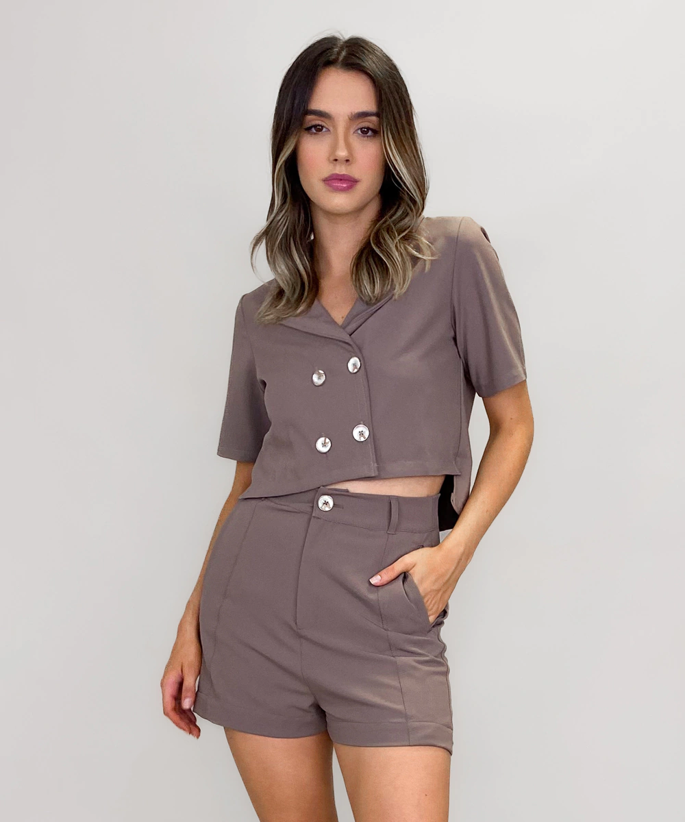 Shorts em tecido Crepe. Modelo cintura alta. Bolsos laterais frontais e bolsos falsos nas costas. Fechamento com zíper e botão. Passantes para cinto.