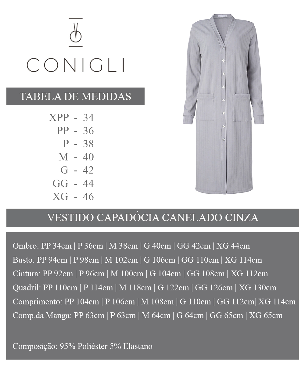 Comprimento: PP 104cm | P 106cm | M 108cm | G 110cm | GG 112cm | XG 114cm